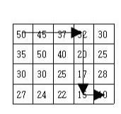현재 제일 왼쪽 위 칸이 나타내는 지점에 있는 세준이는 제일 오른쪽 아래 칸이 나타내는 지점으로 가려고 한다. 그런데 가능한 힘을 적게 들이고 싶어 항상 높이가 더 낮은 지점으로만 이동하여 목표 지점까지 가고자 한다. 위와 같은 지도에서는 다음과 같은 세 가지 경로가 가능하다.